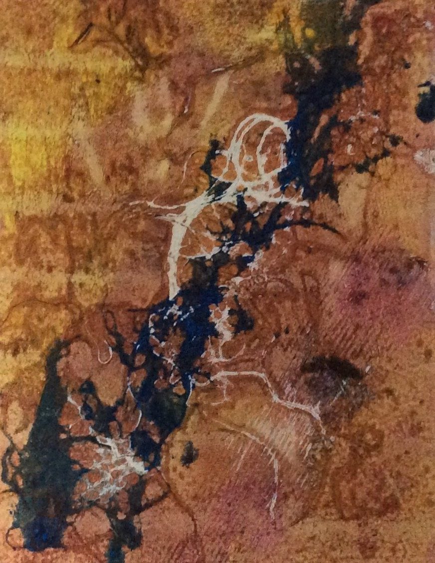 Schilderij in monoprint,met inkt en olieverf,met passe-partout en lijst,in de kleuren beige,okergeel,oranje,en donkerblauw
