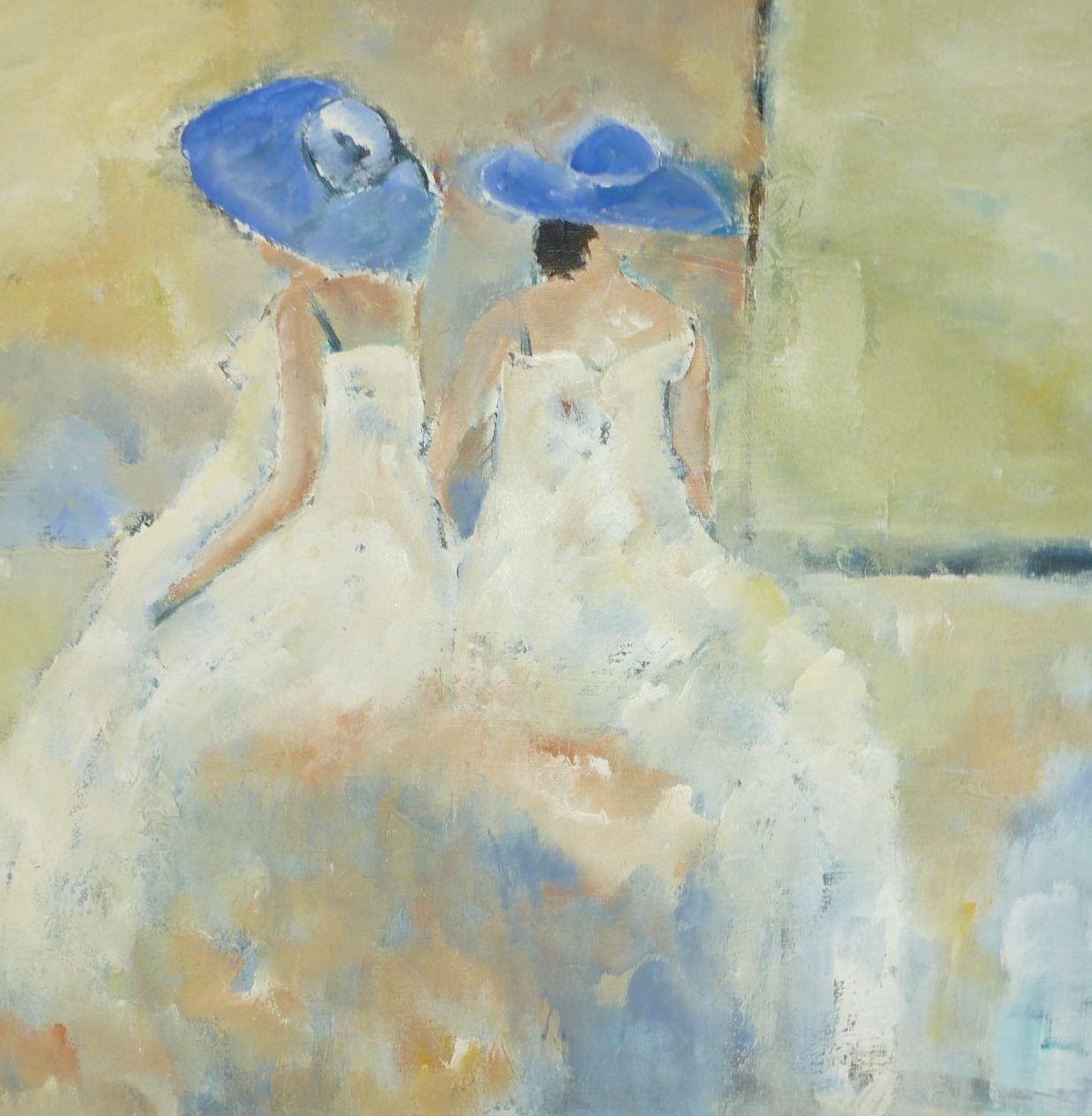 Een globale impressie van het schilderij "Blauwe hoedjes" 100x100cm.