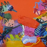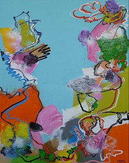 Een globale impressie van het schilderij "Bye bye Birdie" 120x150cm.