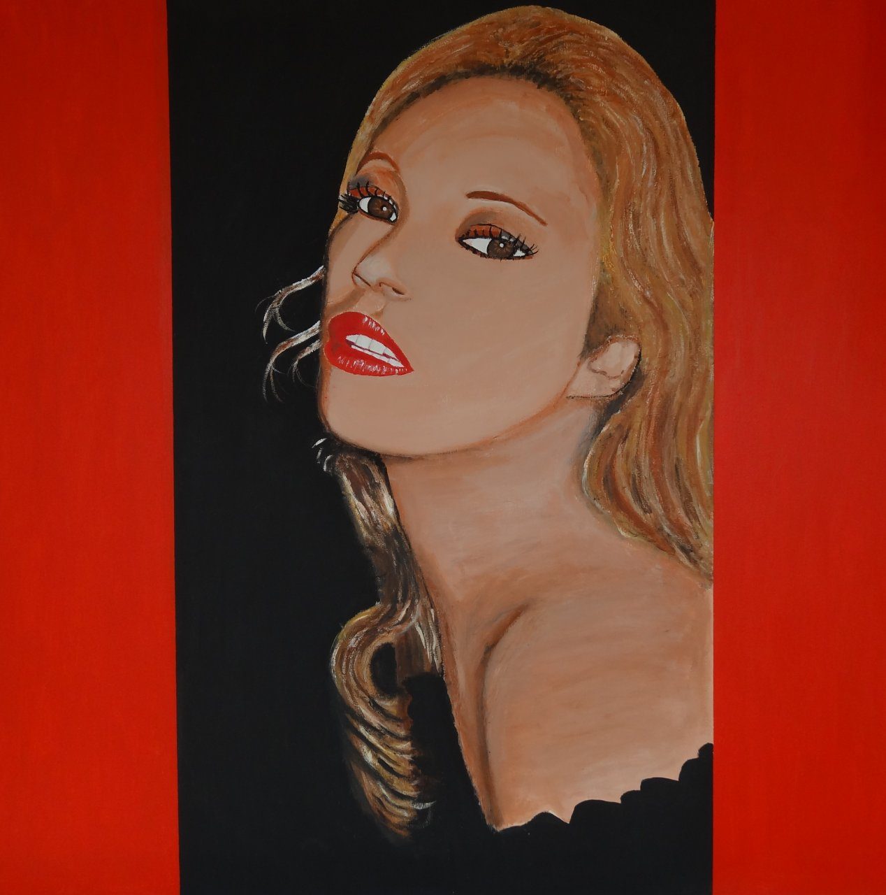 Een globale impressie van het schilderij "Lady in red" 100x100cm.