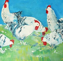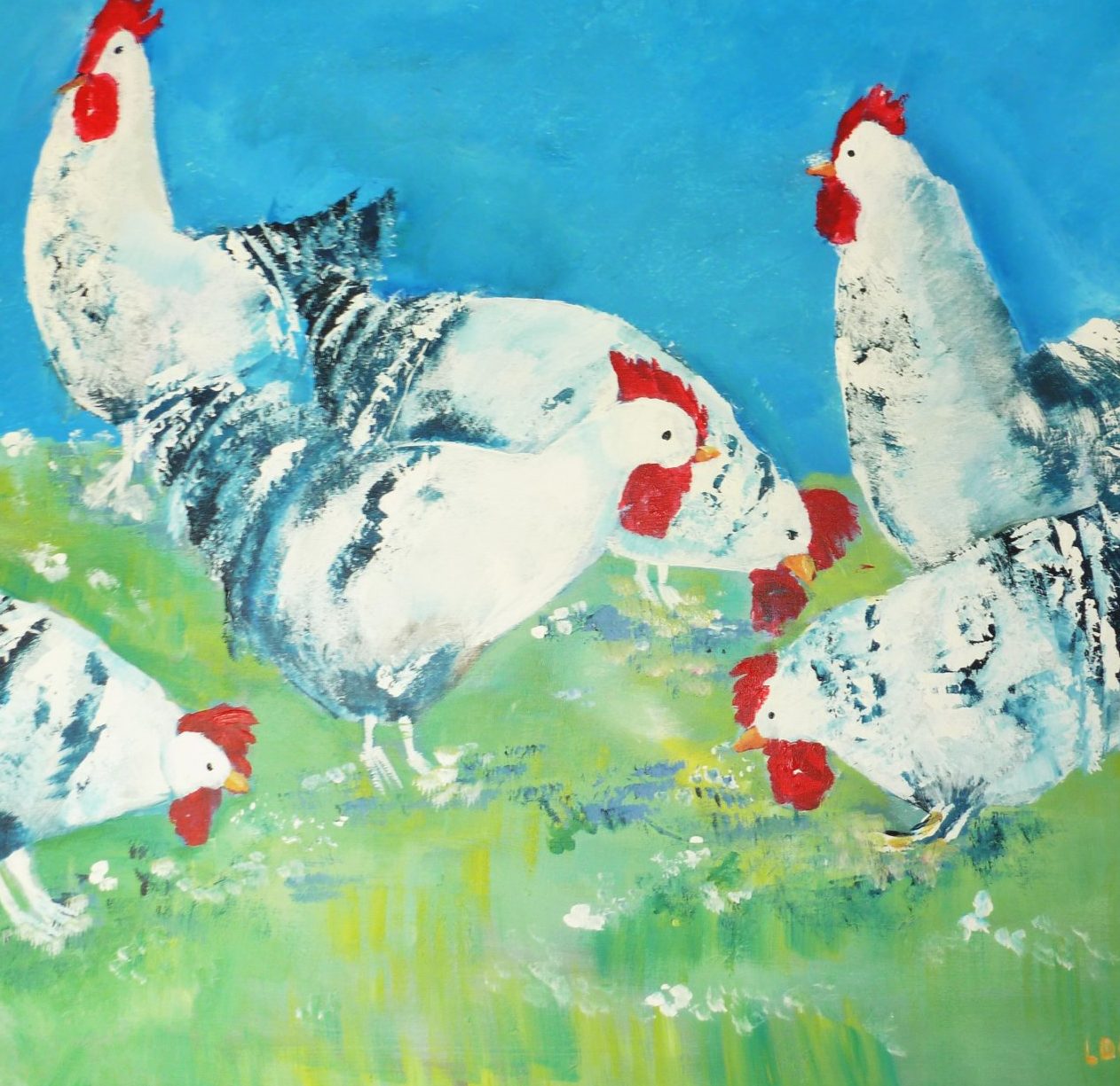 Een globale impressie van het schilderij "Kippen" 100x100cm.