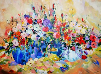 Een globale impressie van het schilderij "Zomerse boeketten" 160x125cm.