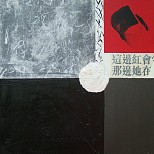 Mixed media, grijs, zwart, rood chinese tekens.