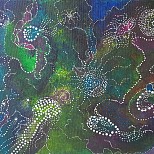 Groen en blauw zijn de hoofdkleuren van dit "onderwater" schilderij. De basis is opgebouwd uit laagjes acryl verf, aangebracht met verschillende technieken. Daarna zijn de lijnen en de fantasie dieren geboren door het volgen van de lijnen op het doek.