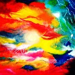 Mystique landscape, geschilderd met acryl op linnen en afgewerkt met varnish voor behoud van de heldere kleuren. Inclusief ophangsysteem. Flink afgeprijsd i.v.m. leegruiming atelier.