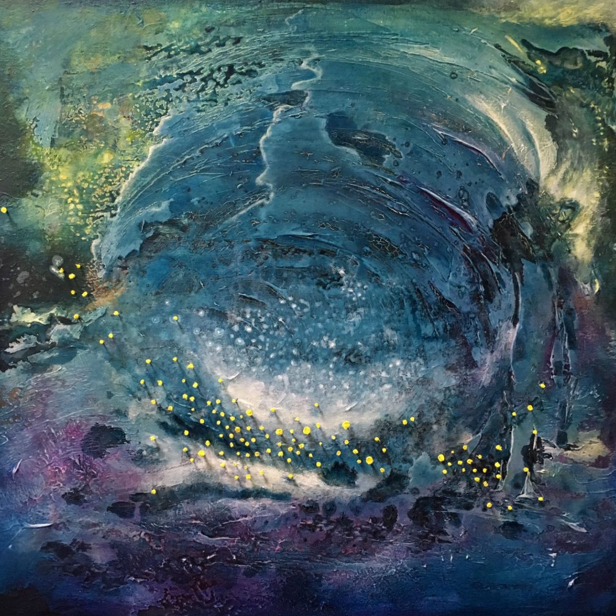 Een globale impressie van het schilderij "Just Passing Through" 50x50cm.