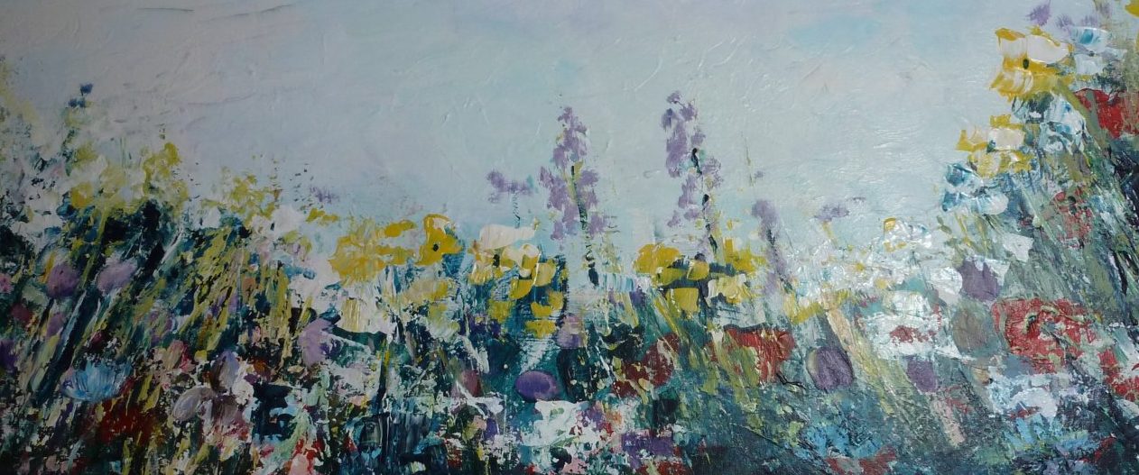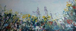 Een globale impressie van het schilderij "Bloemen in de berm" 120x40cm.