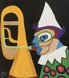 Werk in de stijl van de latere serie van Karel Appel van de circus figuren. Het werk wat op acrylbasis is gemaakt is onder het pseudoniem Moos ( Martin Oosterwijk) gesigneerd. Het werkstuk is bovendien (al) voorzien van een zwarte lijst afgewerkt met zilveren bies.