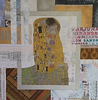 Modern abstract mixed media schilderij opgebouwd uit diverse lagen, dekkend en transparant en met verschillende materialen.