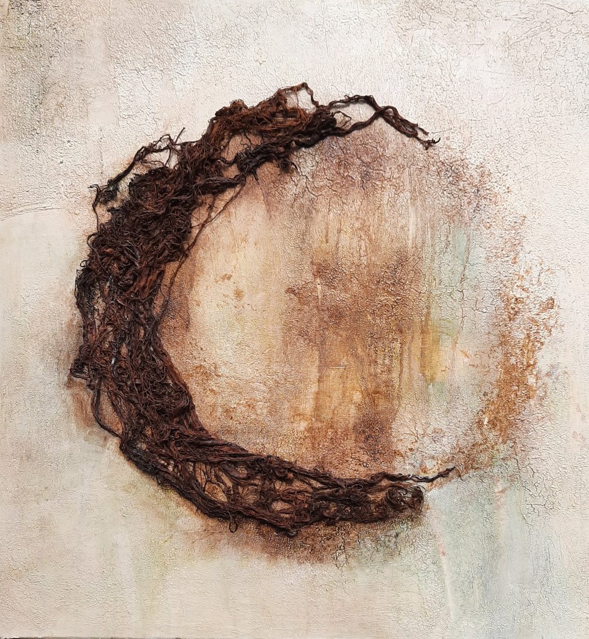 Prachtige roestdraden gemaakt en verwerk als krans op dit doek.