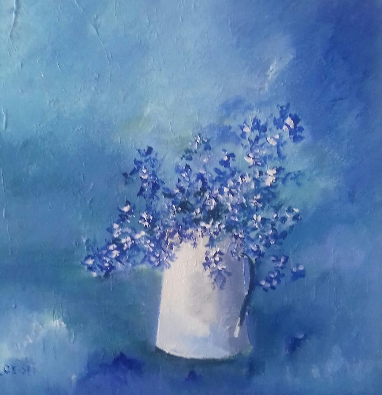 Een globale impressie van het schilderij "Kan met vergeet me nietjes" 60x60cm.