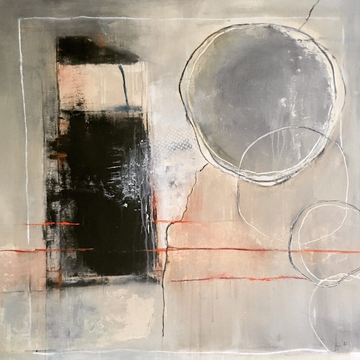 Een globale impressie van het schilderij "Out of the box" 100x100cm.
