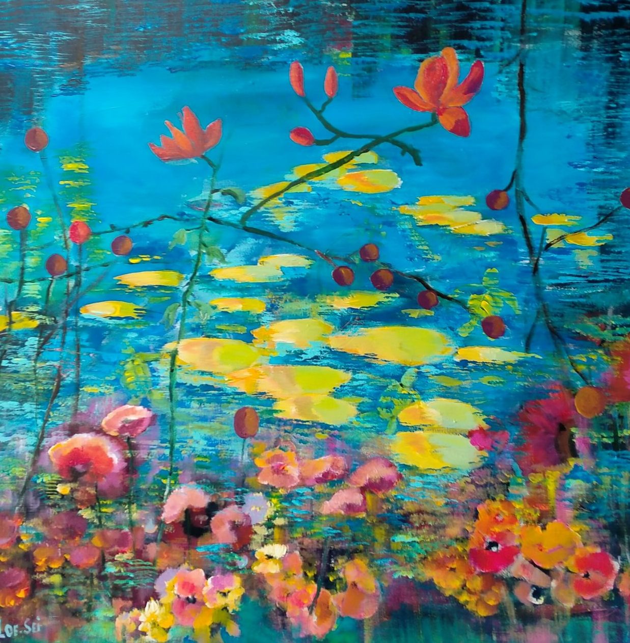 Een globale impressie van het schilderij "Monet in Giverny" 100x100cm.