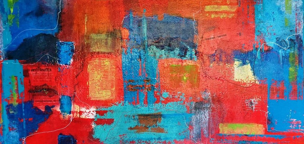 Een globale impressie van het schilderij "Global crisis 'Paletta'" 140x70cm.