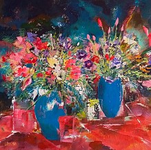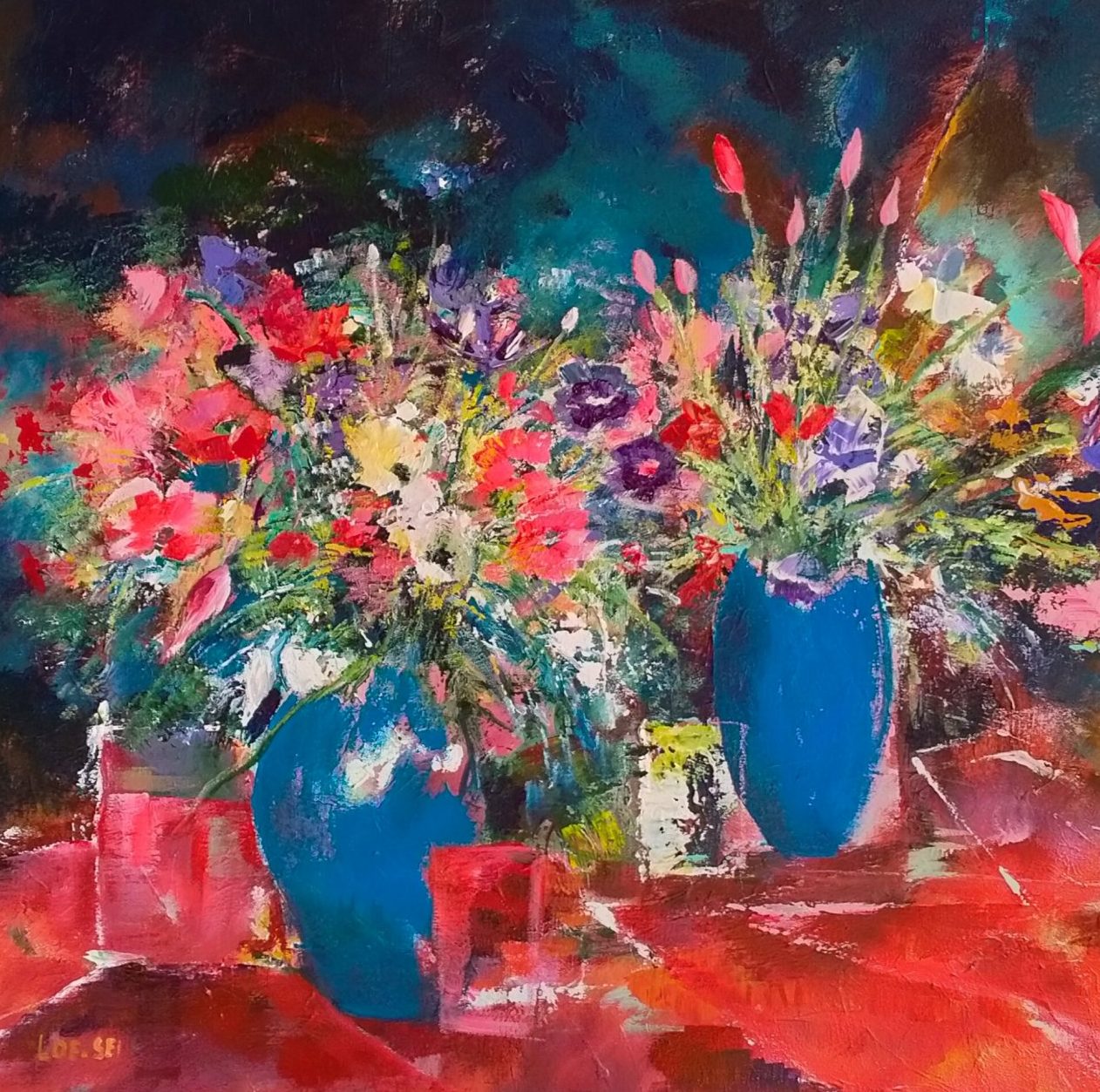 Een globale impressie van het schilderij "Vrolijke bos bloemen" 100x100cm.
