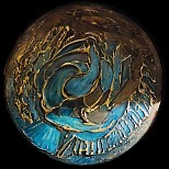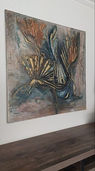 Mixmedia op een groot 90x90 canvas doek met structuurpasta en acrylverf en goudpigment.
