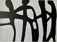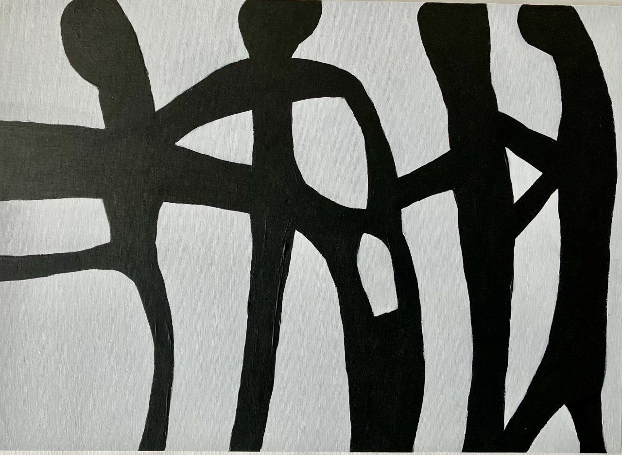 Vier figuren aaneengesloten vormen samen een ""ketting van harmony". Acryl op paneel. Afmeting werkstuk zoals op de afbeelding is 50x 70 Cm. In zijn geheel met geleverde passe partout achter glas is de afmeting 70 x 90 Cm.
