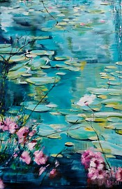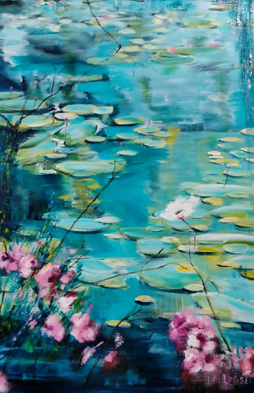 Een globale impressie van het schilderij "Waterlelies" 80x140cm.