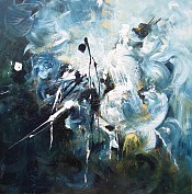 Een globale impressie van het schilderij "Wereld in beweging" 80x80cm.