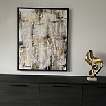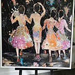 Mixed media Art. Lady,s in goud . Made to Shine . Geëxposeerd in de showroom van Totalhomeconcept in Lelystad. Hier kunt u dit kunstwerk bekijken / aankopen. Made to shine, mixed media. Acryl op doek met goudblad. Afwerking mat vernis. Ophangsysteem aanwezig .Incl. Zwarte lijst formaat 75x105