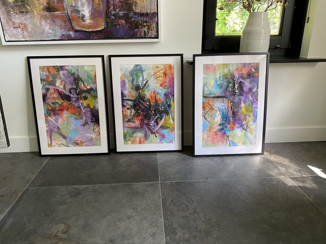 3 schilderijen acryl op papier met pass-partout en zwarte lijsten.