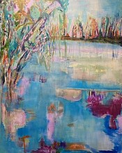 Een landschap, elke dag weer anders qua kleur en waterstand. De kleuren spiegelen in het water dat stdoor het landschap stroomt. De seizoenen kleuren de bladeren en zorgen voor de wisselende waterstanden. De constante beweging en veranderingen van dit wonderschone schouwspel heb ik in dit werk proberen te verbeelden.