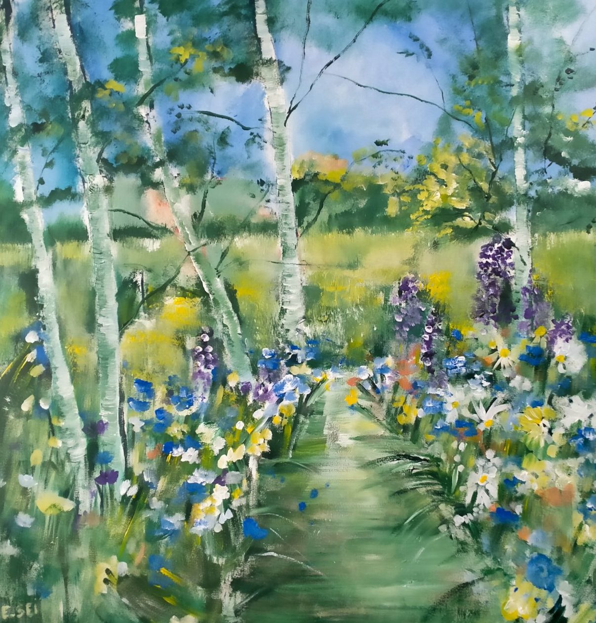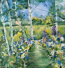 Een globale impressie van het schilderij "Berken bomen" 100x100cm.