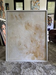 Eenvoud met goud. Mixed media art. Met structuurpasta Dit werk past ook heel mooi bij de japandi stijl.. Afgelakt met witte baklijst en ophangsysteem aanwezig dit werk is te bekijken / of te kopen in de showroom van Totalhome in Lelystad.