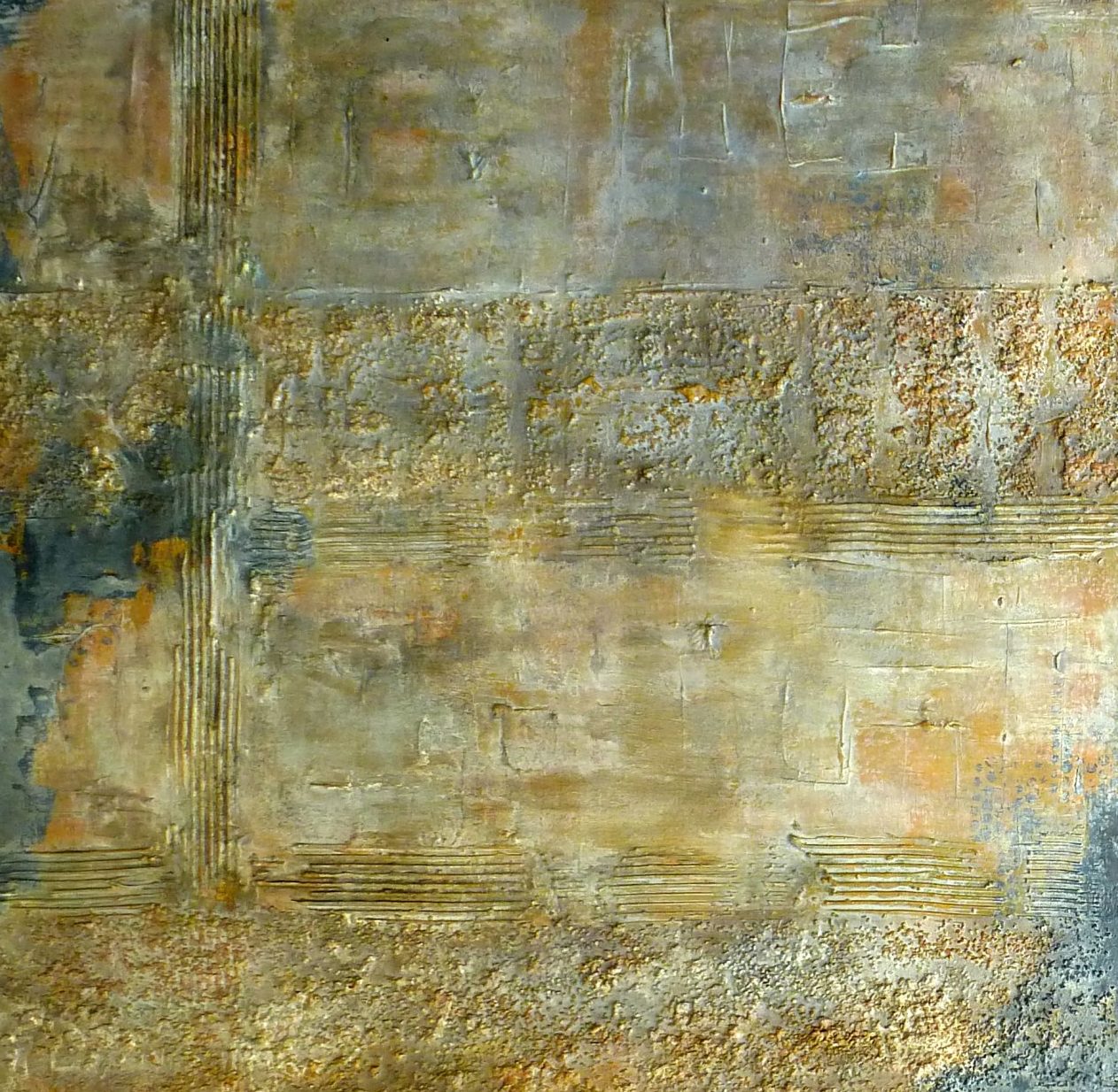 okergeel, grijs en wat gebroken wit,