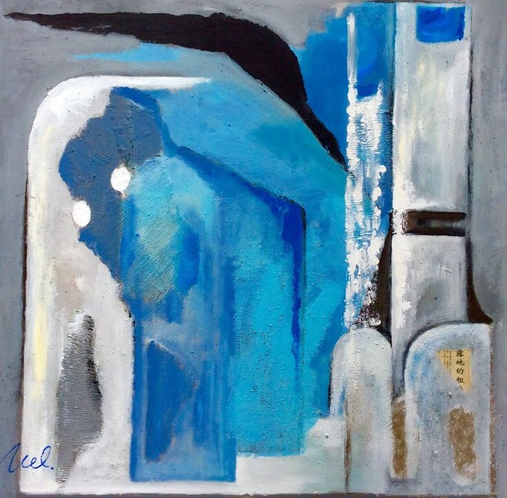 Acryl schilderij in blauw en grijs ,op doek .gemengde techniek